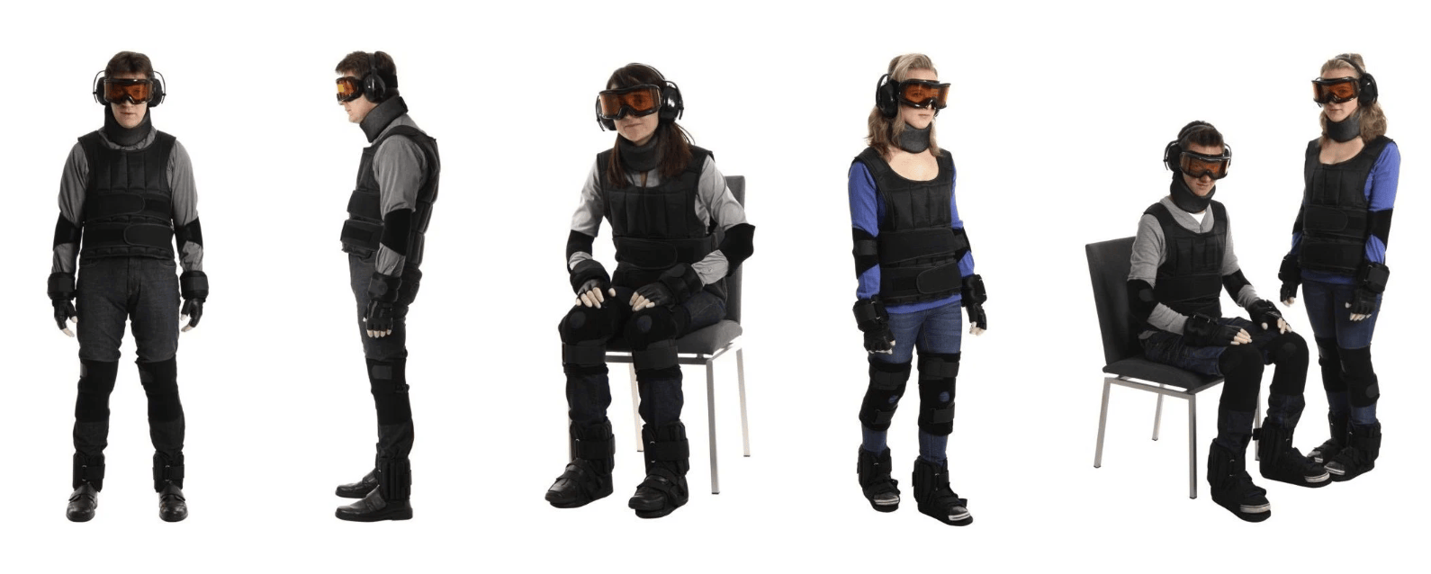 Adam Gopnik, tác giả tờ The New Yorker, thì miêu tả bộ đồ như sau. Một cái kính tròng vàng tạo cảm giác của một đôi mắt già cỗi. Một cái đai đeo cổ gây cản trở chuyển động xương sống vùng cổ. Dây quấn quanh cổ tay, cùi chỏ, và đầu gối mô phỏng sự tắc cứng ở các khớp quan trọng. Đôi giày cao cổ gắn đệm làm mất cảm giác địa hình. Hai đôi găng tay làm giảm cảm nhận bề mặt, cản trở ngón tay co duỗi. [8] Nút tai làm giảm thính lực. Tất cả bộ phận đều bị cản trở.